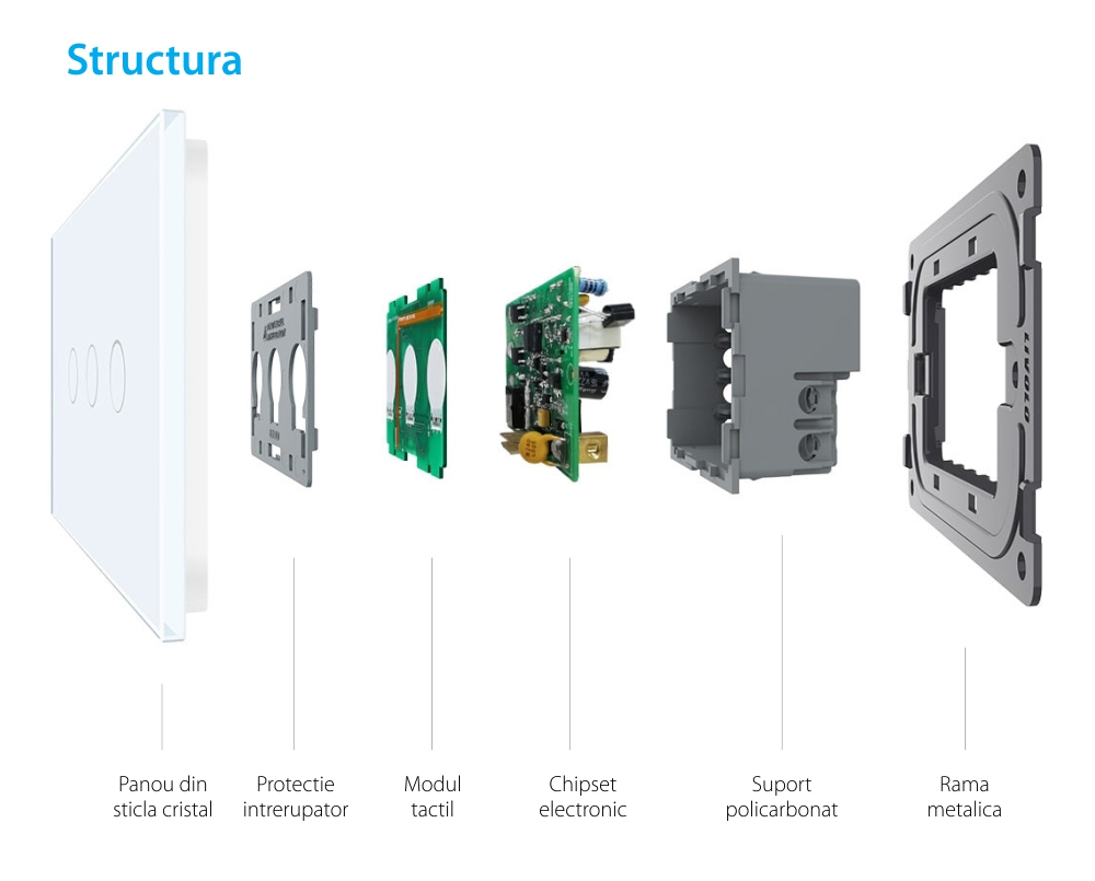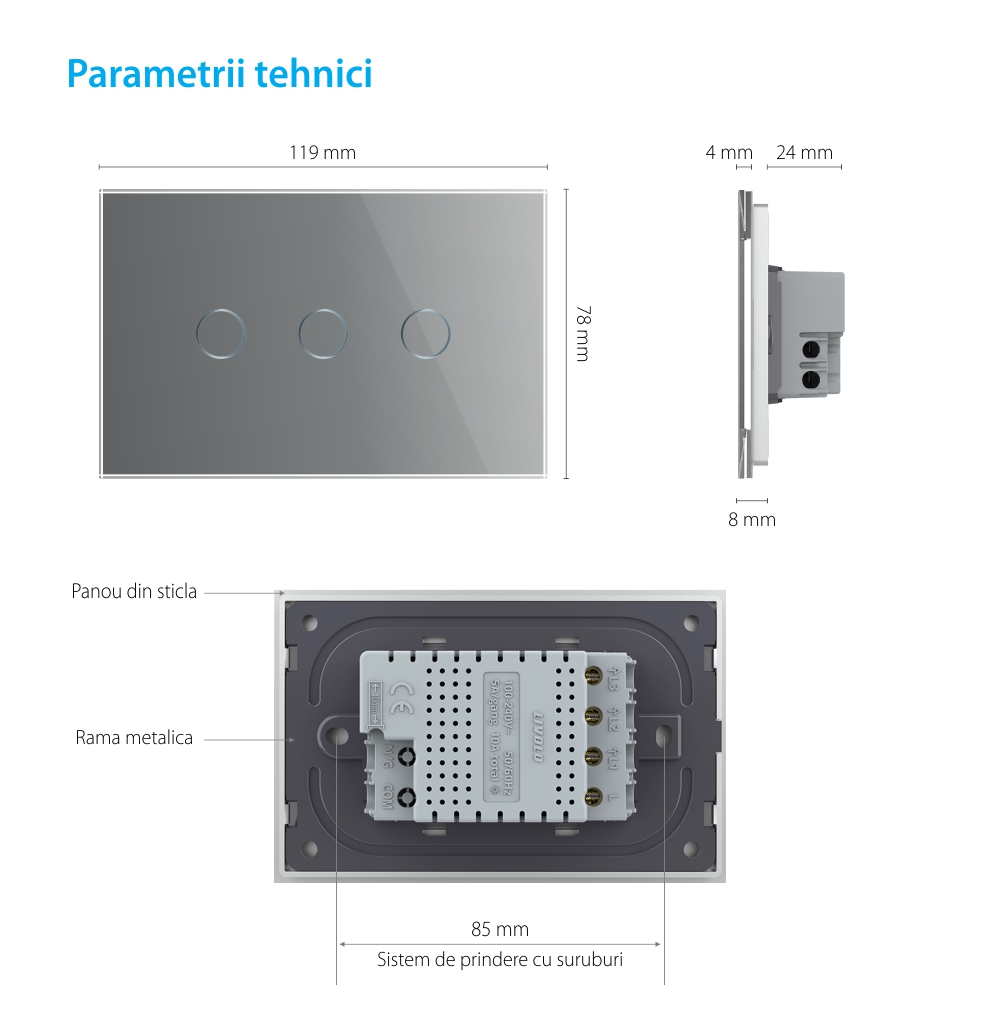 Specificatii Intrerupator triplu touch Livolo sticla, standard
