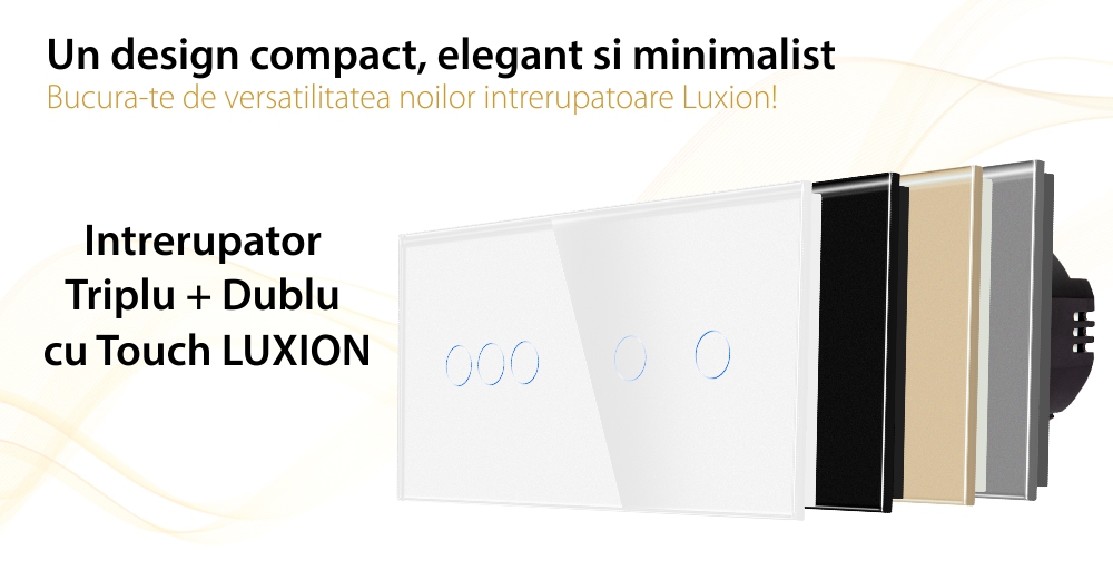 Intrerupator triplu + dublu cu touch din sticla Luxion. Brand-ul de intrerupatoare LUXION se diferentiaza prin design-ul compact, elegant si minimalist. Sunt versatile, iar senzorul tactil este foarte precis, identic cu cel al unui smartphone. Structura este durabila, iar intrerupatoarele nu se decoloreaza in timp. Este un produs practic, fabricat din materiale de calitate si rezistent in timp, ce ofera utilitate si confort casei tale.