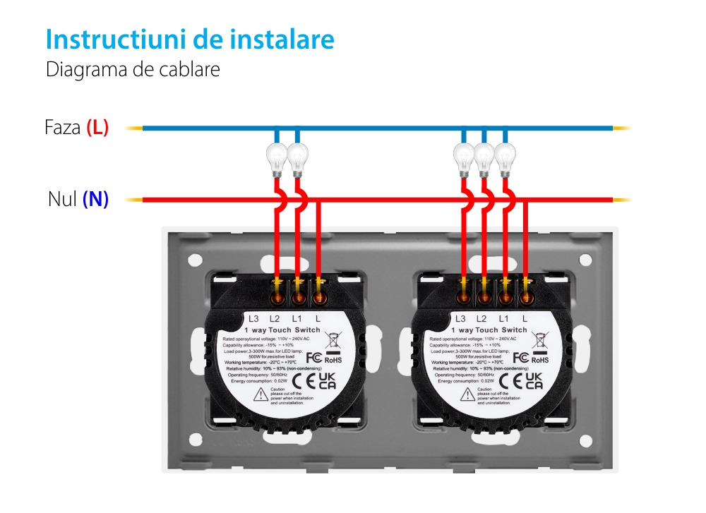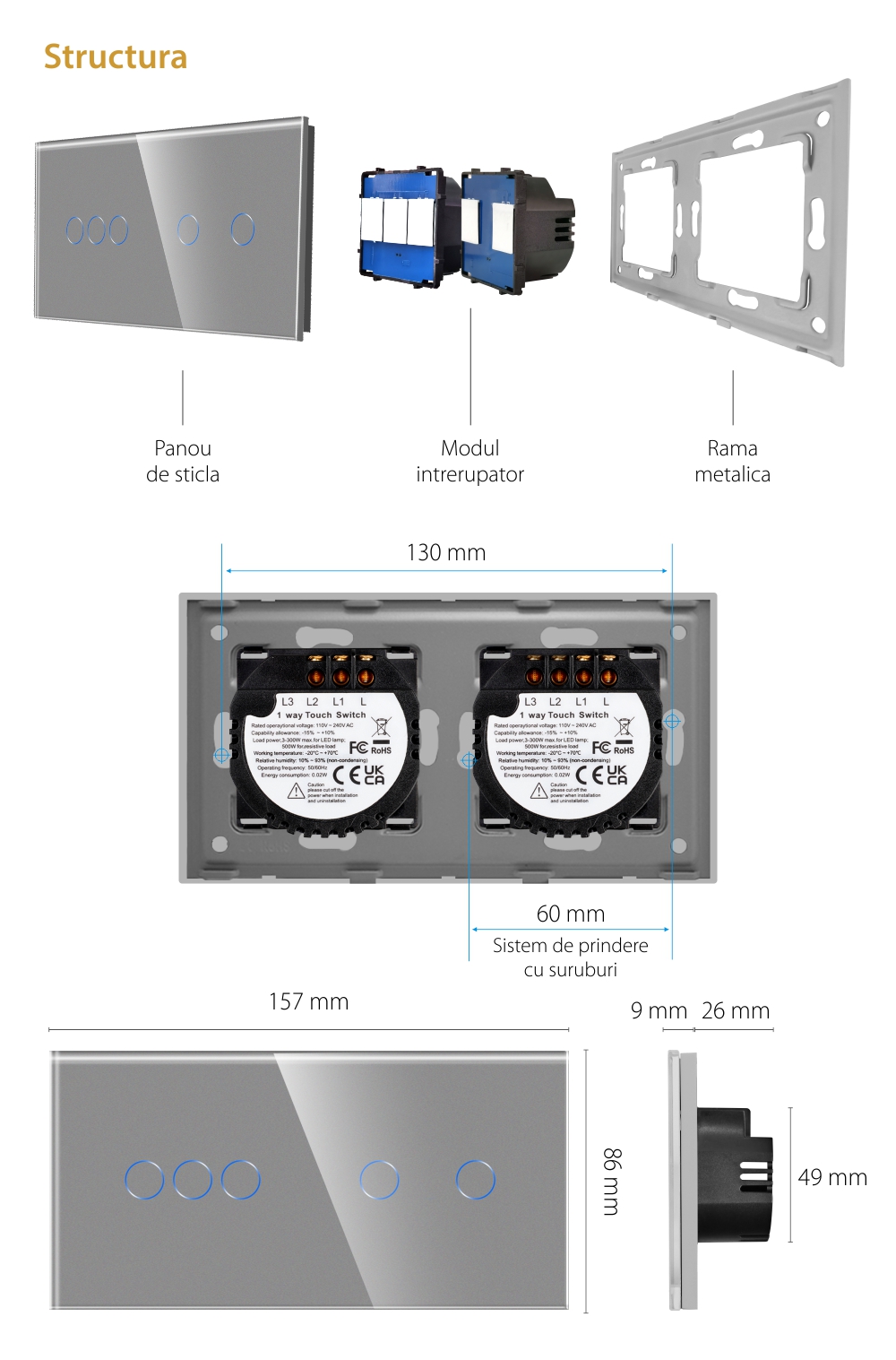 Specificatii Intrerupator Triplu + Dublu Touch Sticla