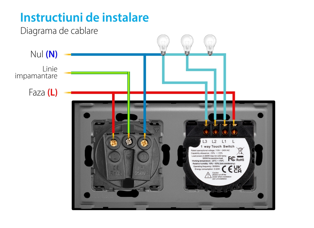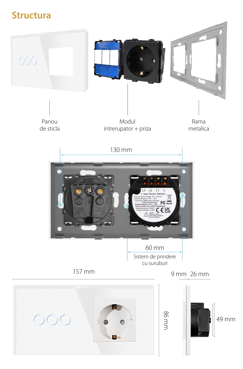 Specificatii Intrerupator Triplu + Priza Rama Sticla