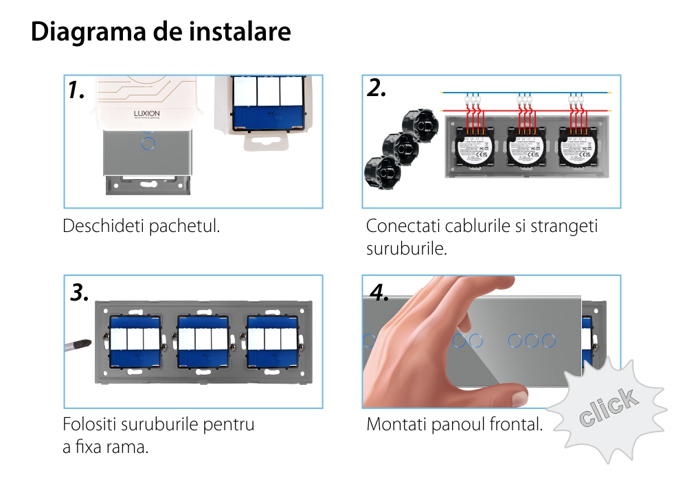 Intrerupator triplu cu touch din sticla Luxion. Brand-ul de intrerupatoare LUXION se diferentiaza prin design-ul compact, elegant si minimalist. Sunt versatile, iar senzorul tactil este foarte precis, identic cu cel al unui smartphone. Structura este durabila, iar intrerupatoarele nu se decoloreaza in timp. Este un produs practic, fabricat din materiale de calitate si rezistent in timp, ce ofera utilitate si confort casei tale.