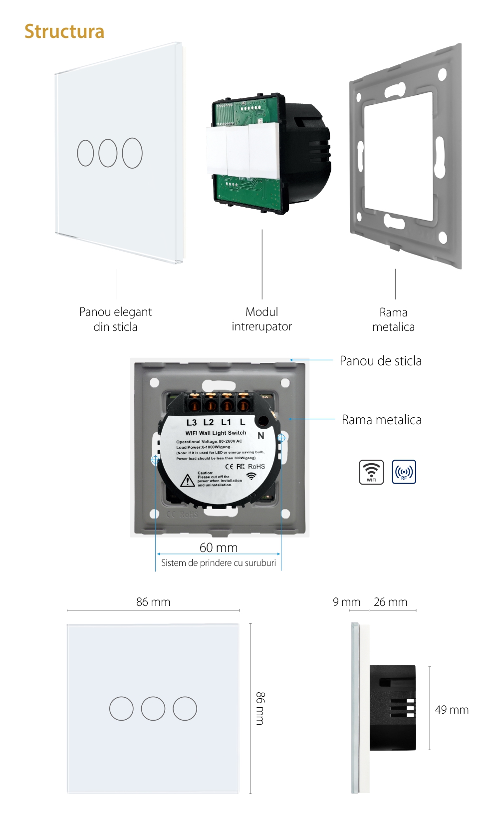 Specificatii Intrerupator Triplu Wi-Fi + RF433 Touch
