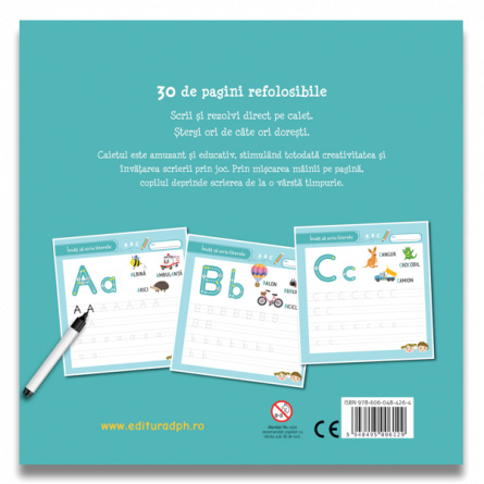 Învaț să scriu literele este un caiet de lucru reutilizabil creat pentru copiii care fac primii pași în lumea scrisului. Prin exerciții simple și atractive, cei mici pot exersa literele alfabetului în ritmul lor, dezvoltându-și coordonarea mână-ochi, motricitatea fină și încrederea în propriile abilități.