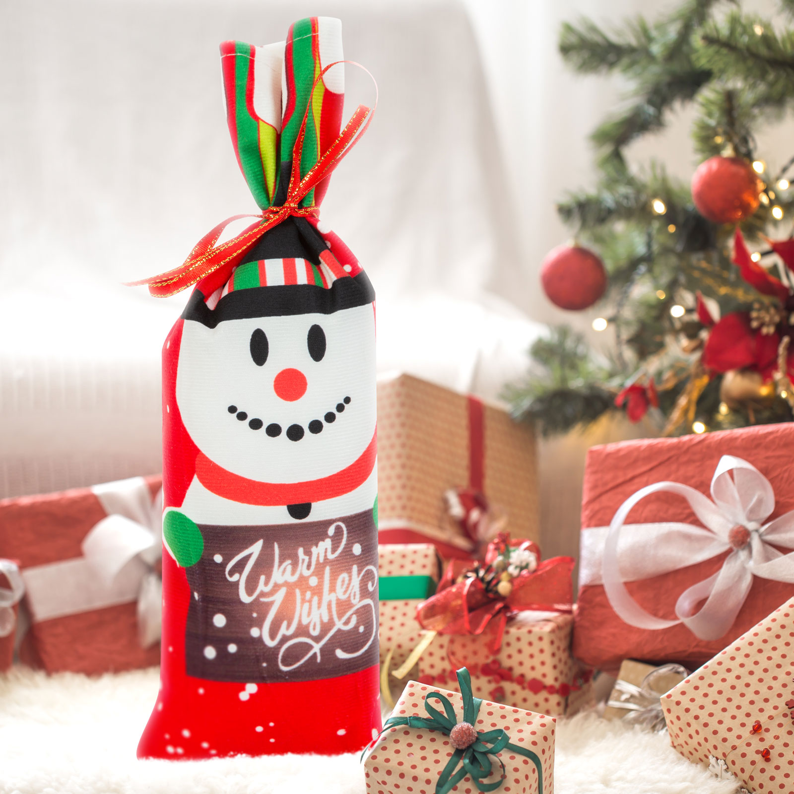 Oferă cadoul de Crăciun cu stil și îmbracă-l într-o ținută pe măsură. Introdu sticlele de băutură în punga de poliester și leagă fundița la gâtul sticlei folosind panglica furnizată!