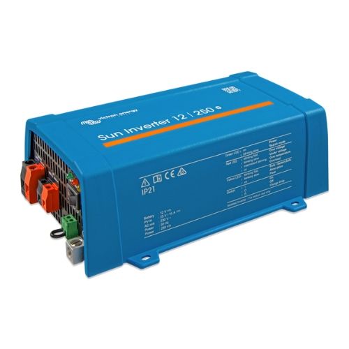 Invertorul de baterie Victron SIN121251100 combina un invertor sinusoidal si un incarcator solar PWM intr-o singura unitate compacta. Acest invertor permite alimentarea echipamentelor casnice care necesita 230 V AC, utilizand baterii de 12V, cu o tensiune de intrare cuprinsa intre 9.2 V si 17 V. Ofera o putere nominala reala de pana la 200 W. Incarcatorul solar integrat este destinat incarcarii bateriilor folosind energia captata de la panouri solare cu 36 de celule (este necesar un singur panou). Sistemul fotovoltaic poate furniza o putere maxima de 375 W.