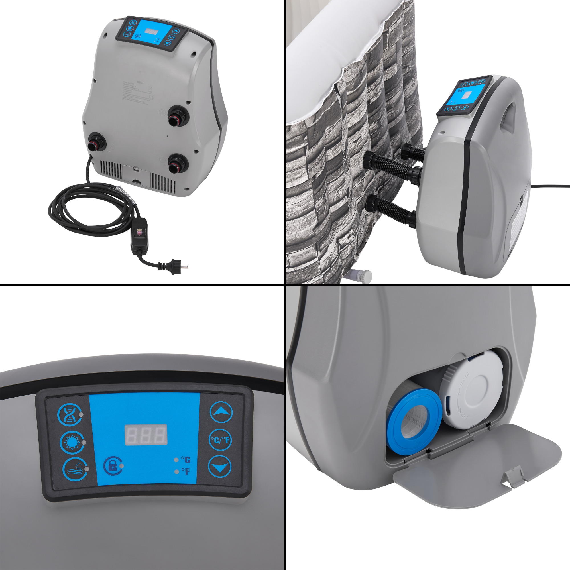 Pompa cu touch display permite control simplu si intuitiv al functiilor principale, astfel incat poti seta rapid temperatura apei, filtrarea sau masajul. Apa poate fi incalzita pana la 42°C, pentru o experienta placuta in orice sezon.