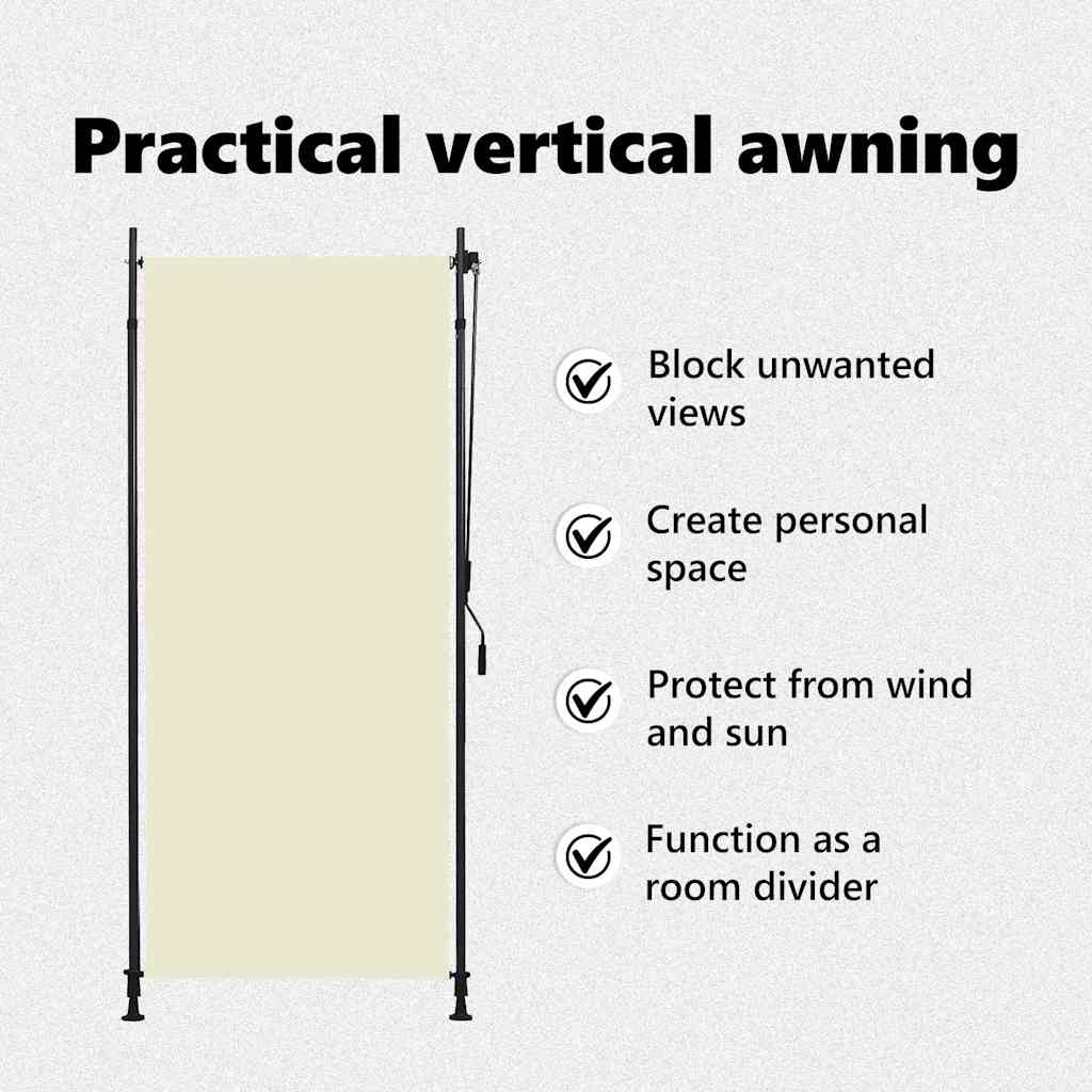 Fabricată din material textil de calitate cu înveliș din PA, jaluzeaua rulabilă este rezistentă la decolorare și poate bloca soarele, permițând însă trecerea aerului. Poate fi rulată în sus și în jos cu ușurință, cu ajutorul sistemului cu manivelă acționat manual. Această copertină verticală este livrată cu doi stâlpi verticali, cu înălțime reglabilă între 2 și 3 m. Se va potrivi cu majoritatea înălțimilor de plafon și poate fi montată cu ușurință.