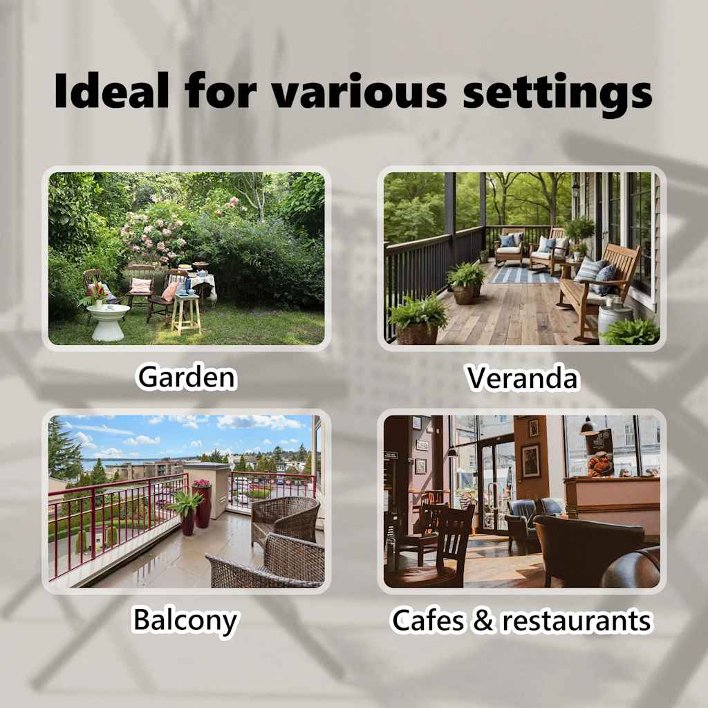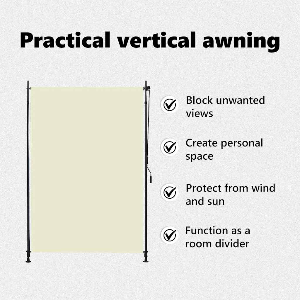 Fabricată din material textil de calitate cu înveliș din PA, jaluzeaua rulabilă este rezistentă la decolorare și poate bloca soarele, permițând însă trecerea aerului. Poate fi rulată în sus și în jos cu ușurință, cu ajutorul sistemului cu manivelă acționat manual. Această copertină verticală este livrată cu doi stâlpi verticali, cu înălțime reglabilă între 2 și 3 m. Se va potrivi cu majoritatea înălțimilor de plafon și poate fi montată cu ușurință.