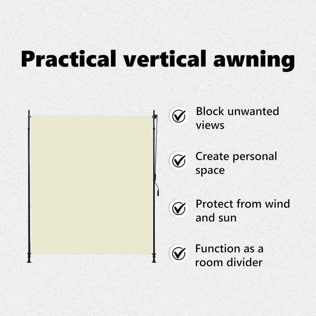 Fabricată din material textil de calitate cu înveliș din PA, jaluzeaua rulabilă este rezistentă la decolorare și poate bloca soarele, permițând însă trecerea aerului. Poate fi rulată în sus și în jos cu ușurință, cu ajutorul sistemului cu manivelă acționat manual. Această copertină verticală este livrată cu doi stâlpi verticali, cu înălțime reglabilă între 2 și 3 m. Se va potrivi cu majoritatea înălțimilor de plafon și poate fi montată cu ușurință.