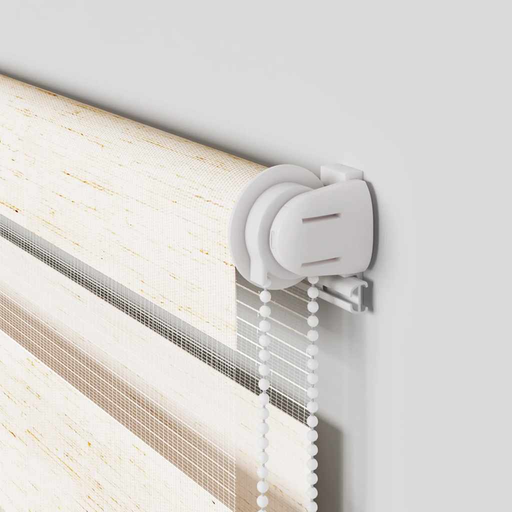- Confidențialitate și protecție solară: Designul cu două straturi prezintă panouri din țesătură transparente și opace, alternante. Lumina poate fi controlată cu ușurință folosind palanul cu lanț, permițând reglarea perfectă a luminii încăperii de la translucid la complet întunecat.