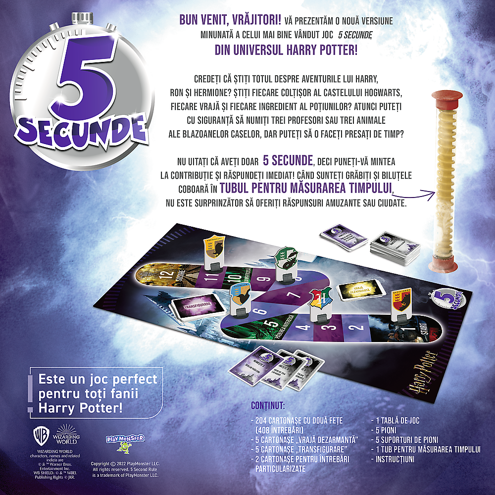 Salut Wizards! O versiune nou-nouta, neobisnuita a celui mai bine vandut joc 5 Seconds, plasat in lumea Harry Potter! Crezi ca stii totul despre aventurile lui Harry, Ron si Hermione? Cunosti fiecare colt al Hogwarts, fiecare vraja si ingredient al potiunii? Dar poti sa o faci sub presiunea timpului? Ai la dispozitie doar 5 secunde, asa ca renunta la memorie si nu intarzia sa raspunzi. Intra in Un joc care va ajuta sa ganditi si sa vorbiti mai rapid! Suntem siguri ca puteti enumera trei rase de caini diferite! Puteti face insa acest lucru contra cronometru? Atentie, aveti doar 5 secunde la dispozitie iar adversarii abia asteapta sa gresiti! Timpul nu este de partea dumneavoastra, asa ca raspundeti chiar daca nu sunteti sigur ca este corect! Uneori veti da raspunsuri ciudate, alteori amuzante, in timp ce bilele se rotesc in temporizatorul special. Daca aveti noroc, veti putea sa va eschivati de la o anumita cerinta sau o veti putea transmite altui jucator. Distractia este asigurata atunci cand toti jucatorii ajung la final cat mai repede posibil! 5 secunde este un joc distractiv si imprevizibil, pentru familie si prieteni! Pentru 3-6 jucatori. Varsta minima peste 8 ani.