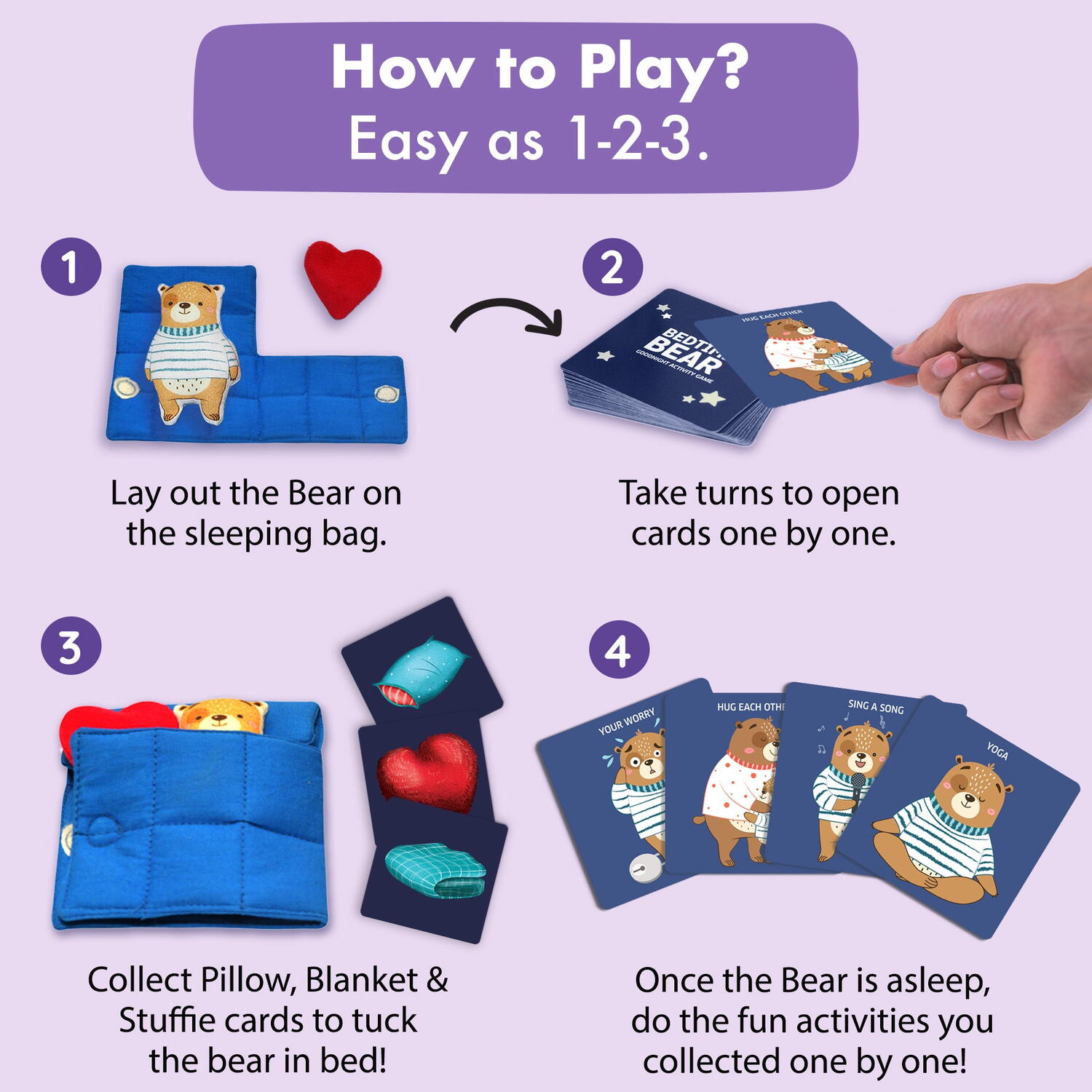 Puneti ursuletul in pat si incepeti sa deschideti, pe rand, cele 23 de carti incluse in joc.