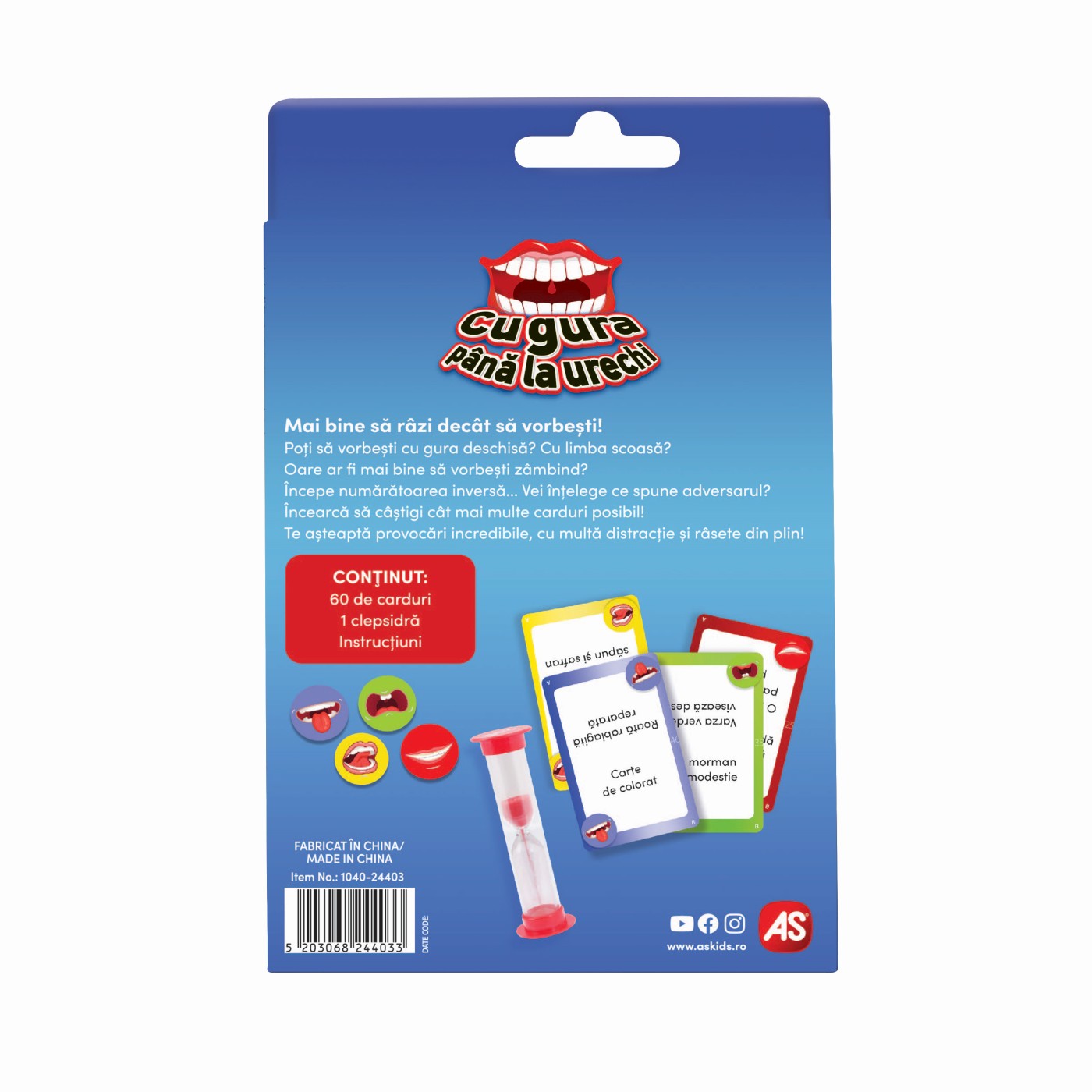 Jocul de cărți Cu gura până la urechi este alegerea perfectă pentru seri pline de râsete, provocări și momente memorabile alături de familie sau prieteni. Conceput pentru copii de peste 10 ani și adulți, acest joc amuzant de societate pune la încercare rapiditatea, atenția și buna dispoziție. Este ideal pentru petreceri, întâlniri în familie sau activități de grup.