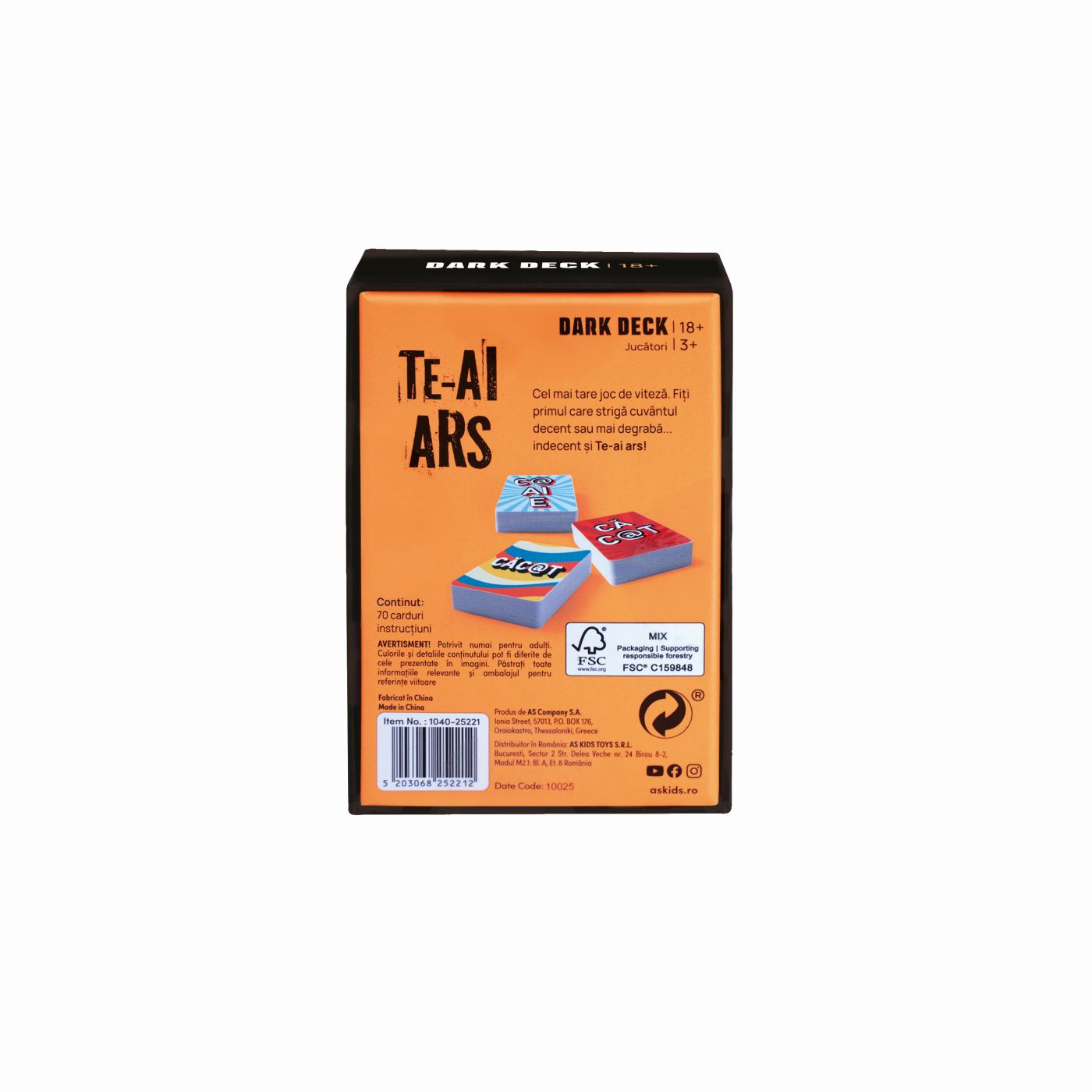 Jocul suprem de viteza! Fii primul care striga cuvantul corect sau mai degraba... cuvantul gresit si Te-ai ars! Numar jucatori 3+. Varsta recomandata 18+ ani. Continut 70 carti, instructiuni. Continutul este destinat strict adultilor de 18 ani si peste.