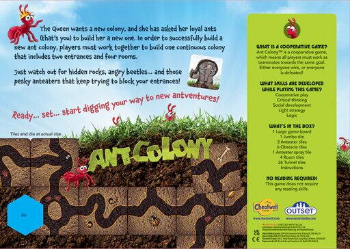 Jocul de cooperare pentru copii Colonia de Furnici ii provoaca pe cei mici sa lucreze impreuna pentru a construi o colonie subterana sigura si bine organizata. Este un joc educativ si captivant, in care toti jucatorii au acelasi obiectiv: sa termine constructia inainte ca obstacolele sa le incurce planurile.