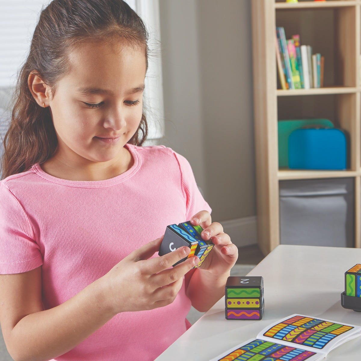 Mod de utilizare: alege o provocare din ghidul inclus, aseaza cuburile in tava si roteste-le pana cand obtii modelul corect. Pe masura ce avanseaza, copilul isi imbunatateste abilitatile de analiza si strategie intr-un mod distractiv.