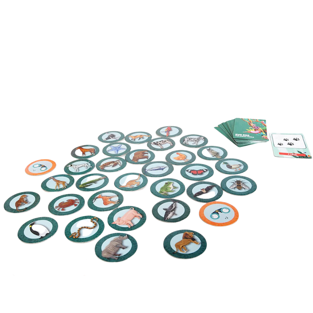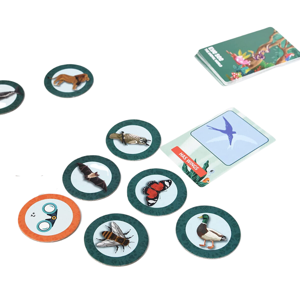 Cum se joacă: jetoanele cu animale se pun în centrul mesei, cardurile cu caracteristici se așază separat cu fața în jos, apoi se întoarce câte un card. Fiecare jucător caută animalele care corespund caracteristicii indicate. Primul jucător care adună 5 carduri câștigă.