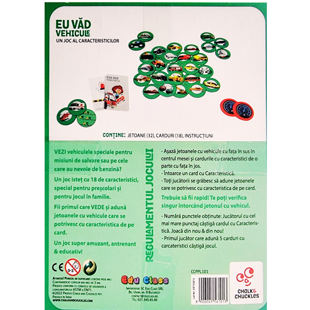 - Continut set: 32 jetoane cu vehicule, 18 carduri cu caracteristici, instructiuni