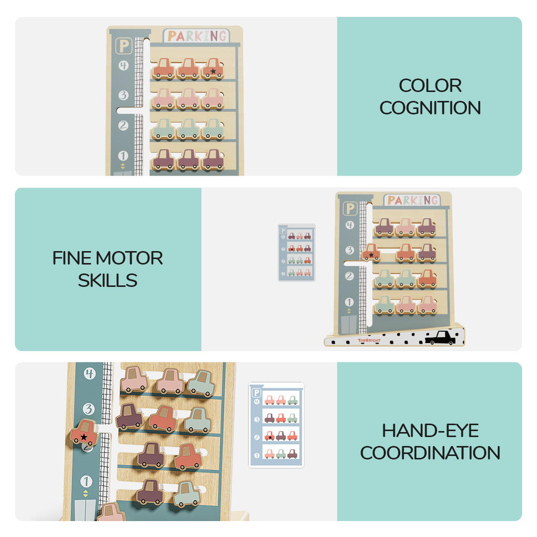 Mod de utilizare: alege un card de activitate si reprodu configuratia indicata, apoi muta masinutele doar pe tabla pana cand toate sunt parcate corect. Pentru si mai multa distractie, copilul poate inventa propriile variante de joc si parcare.