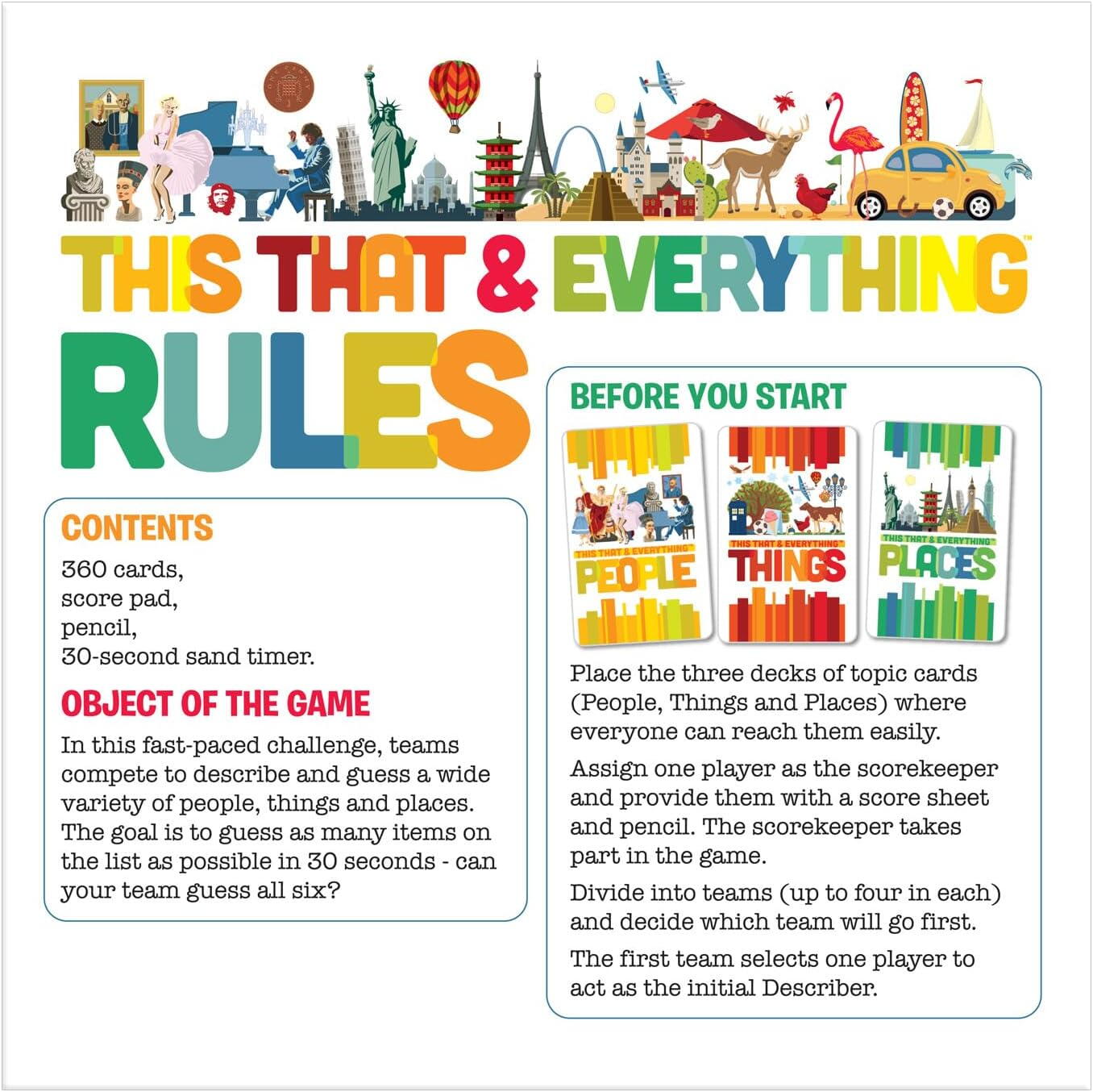 Mod de utilizare: un jucator extrage un card si descrie elementele de pe lista, fara a pierde timp pretios. Colegii de echipa trebuie sa ghiceasca raspunsurile corecte in mai putin de 30 de secunde. Echipa care aduna cele mai multe puncte castiga.