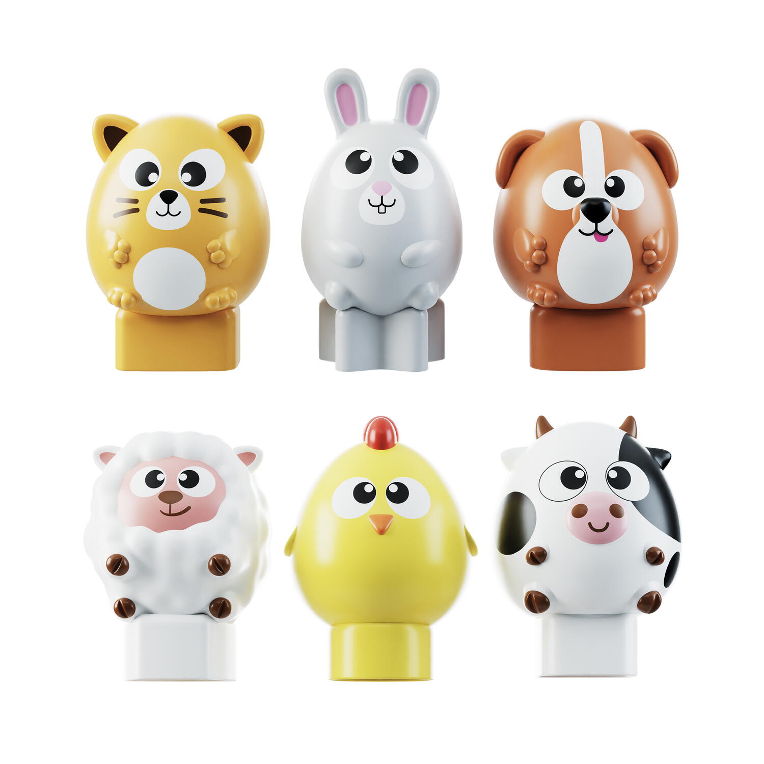 Copiii invata sa recunoasca si sa potriveasca cele 6 animale de la ferma pe baza special conceputa cu orificii autocorectoare, stimuland coordonarea mana-ochi