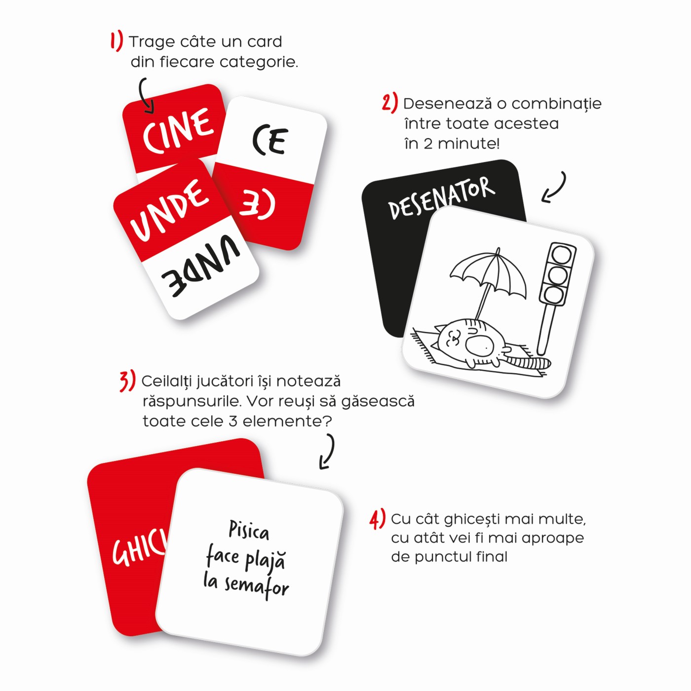 Mod de utilizare: fiecare jucator sau echipa extrage o tema, o deseneaza in timpul oferit de clepsidra, iar ceilalti incearca sa ghiceasca. Castiga cine avanseaza primul pana la punctul final de pe tabla de joc.