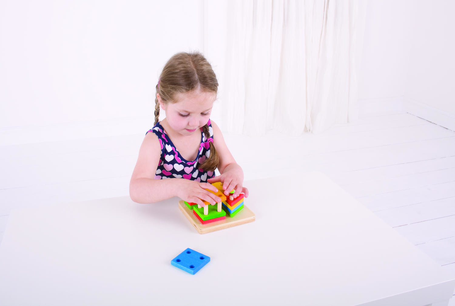 Mod de utilizare: copilul potriveste fiecare piesa pe suportul corespunzator, in functie de forma si de numarul de gauri. Piesele pot fi sortate, stivuite si rearanjate de mai multe ori, pentru sesiuni repetate de joaca educativa.