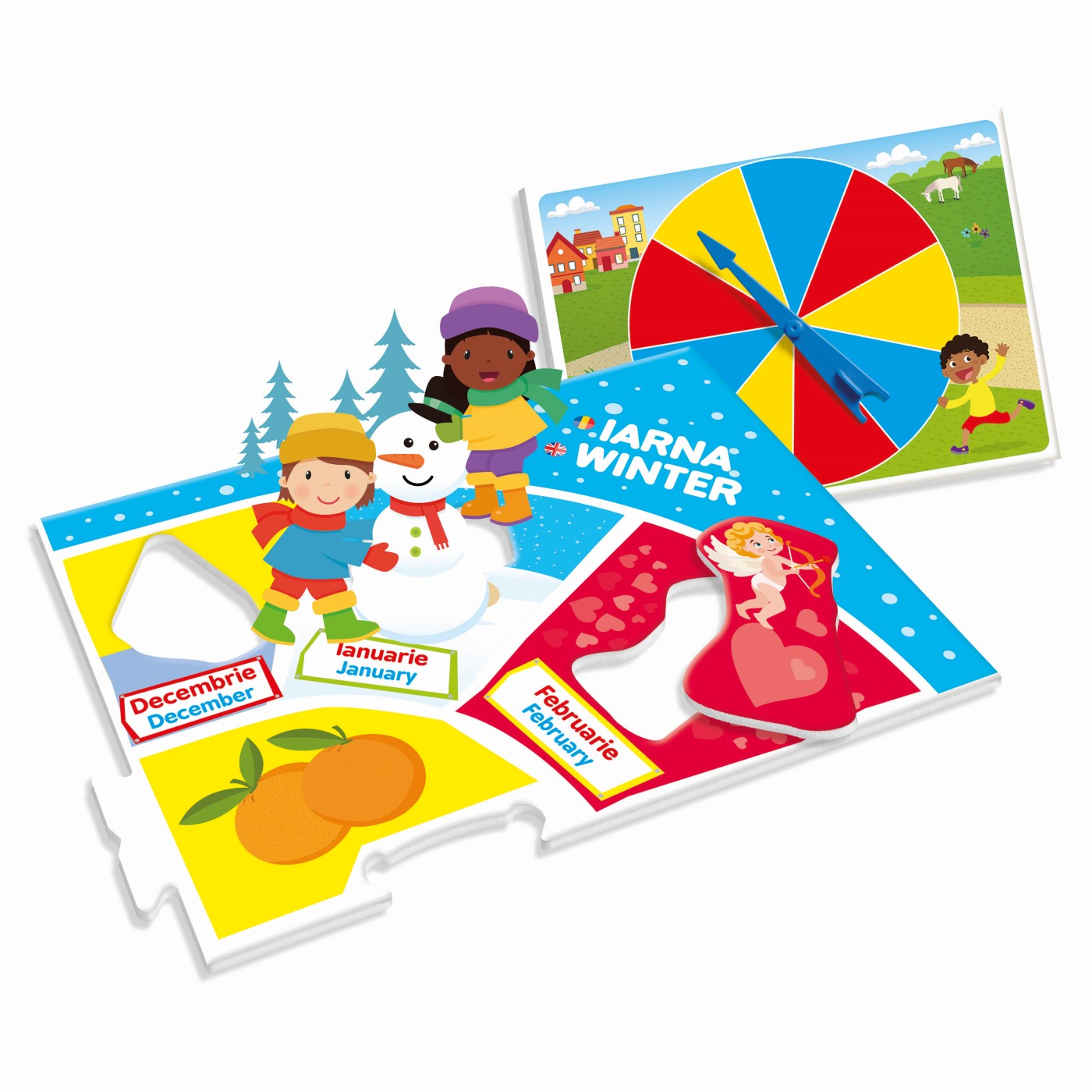 Mod de utilizare: copilul poate potrivi lunile cu anotimpurile corespunzatoare, poate identifica imagini si evenimente caracteristice fiecarei perioade din an si poate folosi ruleta pentru diverse variante de joc. Activitatile incluse incurajeaza invatarea activa si interactiunea.