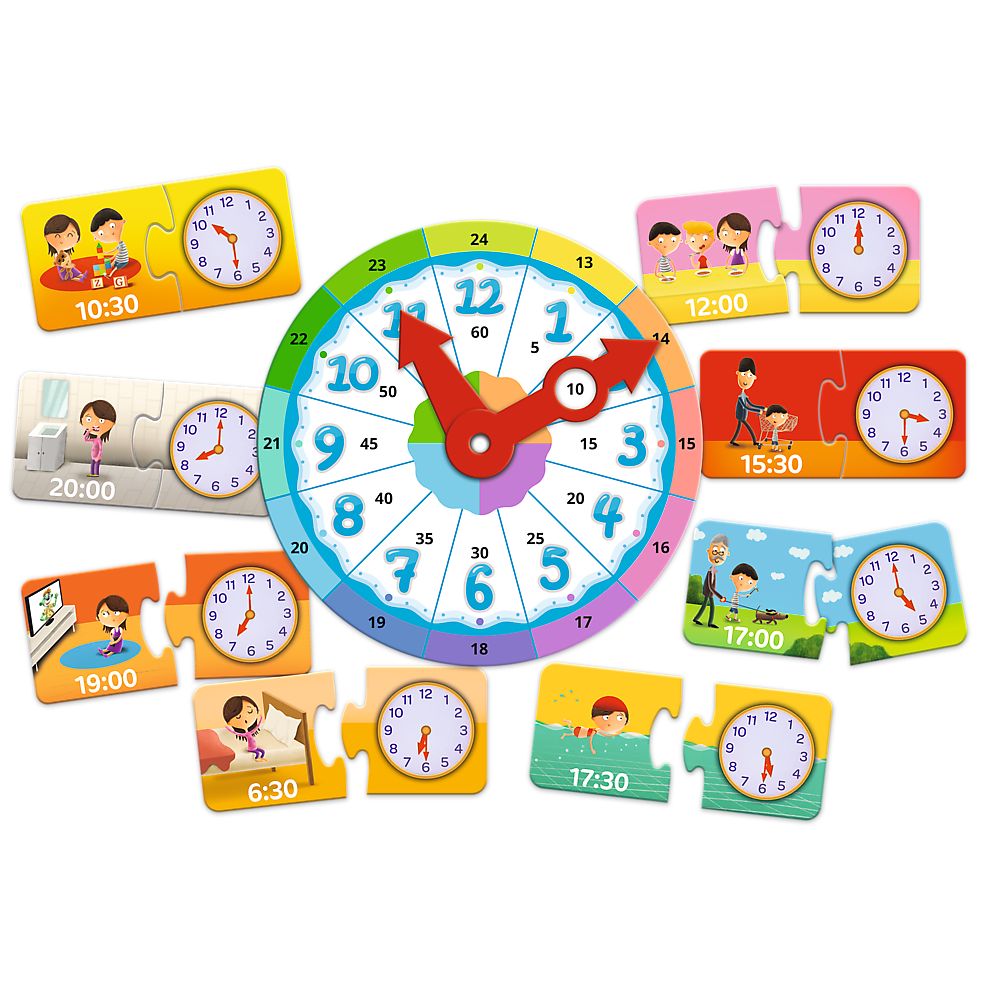 Mod de utilizare: copilul potrivește piesele puzzle cu imaginile și orele corespunzătoare, apoi folosește ceasul cu limbi mobile pentru a reproduce ora indicată. Astfel, învață treptat să citească ceasul și să recunoască diferite momente ale zilei într-un mod interactiv.