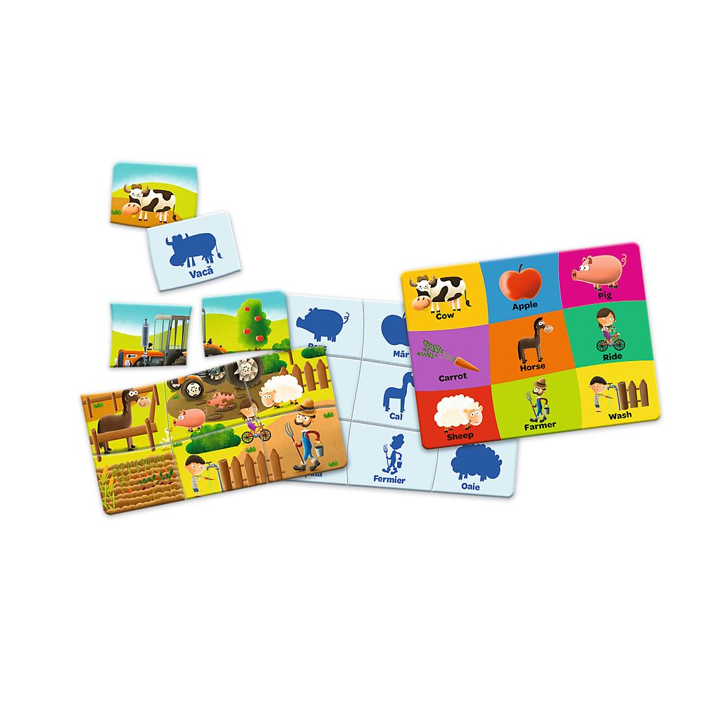 Mod de utilizare: copilul asociază imaginile cu denumirile corespunzătoare în română și engleză, repetând și recunoscând cuvintele în contexte vizuale clare. Jocul poate fi folosit pentru exersare zilnică, învățare ghidată sau activități interactive în familie.
