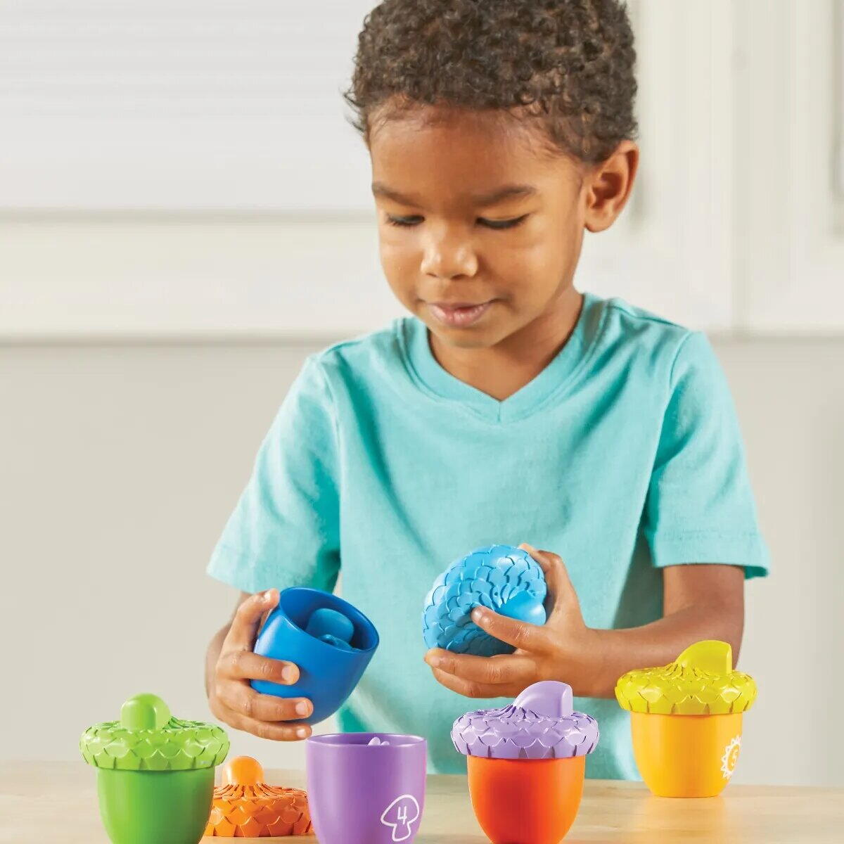 Fiecare ghinda ascunde o veverita colorata, iar copilul poate deschide capacele texturate, poate potrivi piesele dupa culoare sau forma si poate numara de la 1 la 5. Este un joc educativ ideal pentru activitati interactive acasa, la gradinita sau in centre de invatare timpurie.