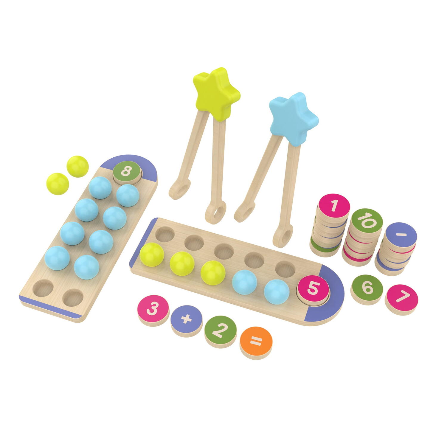 Setul este potrivit atat pentru acasa, cat si pentru gradinita sau activitati educative in grup. Bilele colorate, jetoanele cu cifre si simboluri matematice, dar si pensetele din lemn adauga o componenta tactila valoroasa, sustinand dezvoltarea motricitatii fine si a rabdarii.