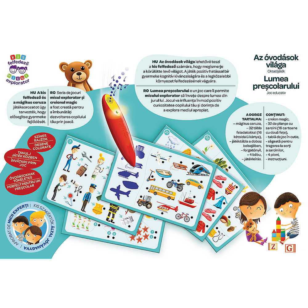 Cu ajutorul planșelor cu sarcini și al creionului magic, copilul poate identifica răspunsuri, exersa asocierea imaginilor și învăța noțiuni noi despre obiecte, animale și mediul înconjurător. Este un joc educativ copii 4 ani ideal pentru acasă, grădiniță sau pentru momente de joacă în familie.