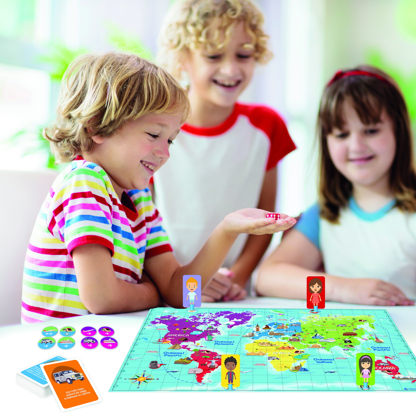 Mod de utilizare: jocul se desfășoară pe planșa inclusă, iar copiii înaintează către diferite destinații din lume. Pe parcurs, folosesc elementele de joc și iau decizii rapide pentru a-și completa călătoria înaintea adversarilor. Este ideal pentru joacă acasă, în familie sau alături de prieteni.
