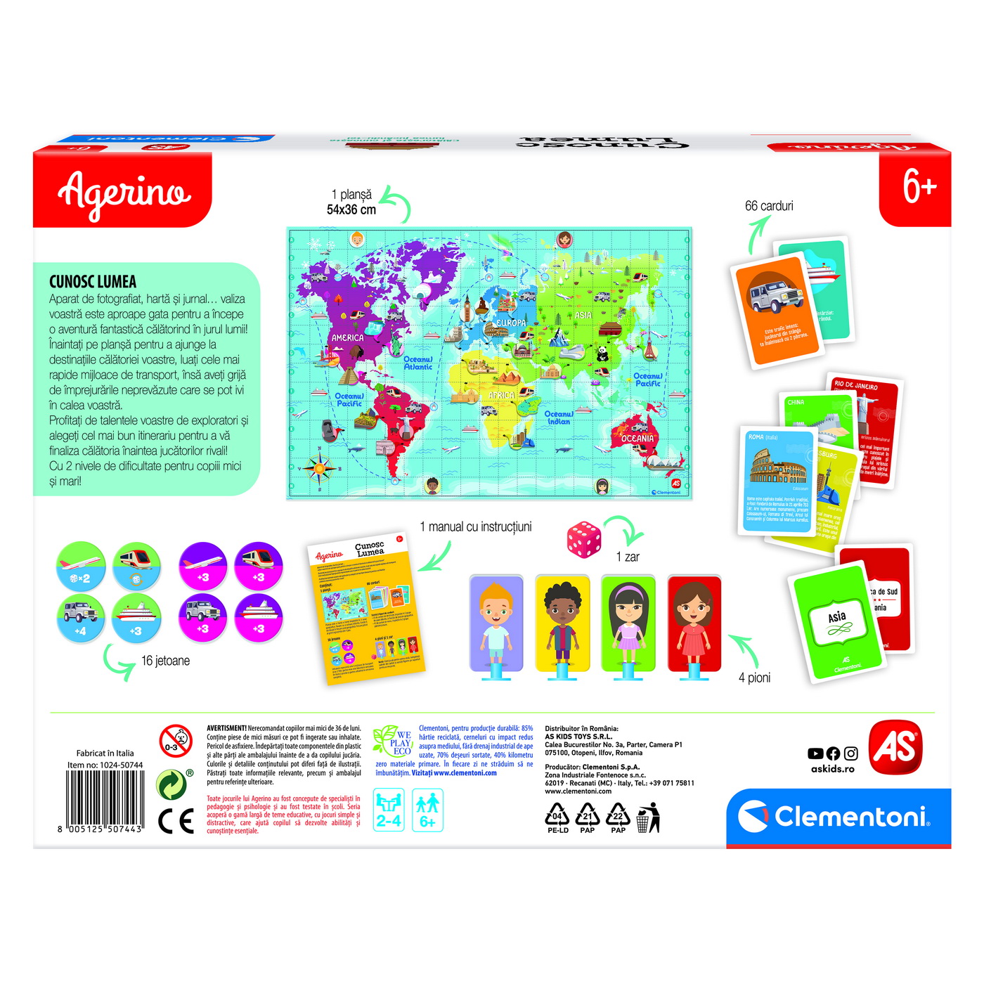 Jocul educativ Agerino Cunosc Lumea îi invită pe cei mici într-o aventură captivantă în jurul globului. Cu ajutorul unei planșe de joc, al unui aparat de fotografiat, al hărții și al jurnalului de călătorie, copiii descoperă locuri fascinante, aleg rute inspirate și învață prin joacă. Este un joc de societate pentru copii potrivit pentru dezvoltarea cunoștințelor despre lume, a gândirii strategice și a spiritului de observație.