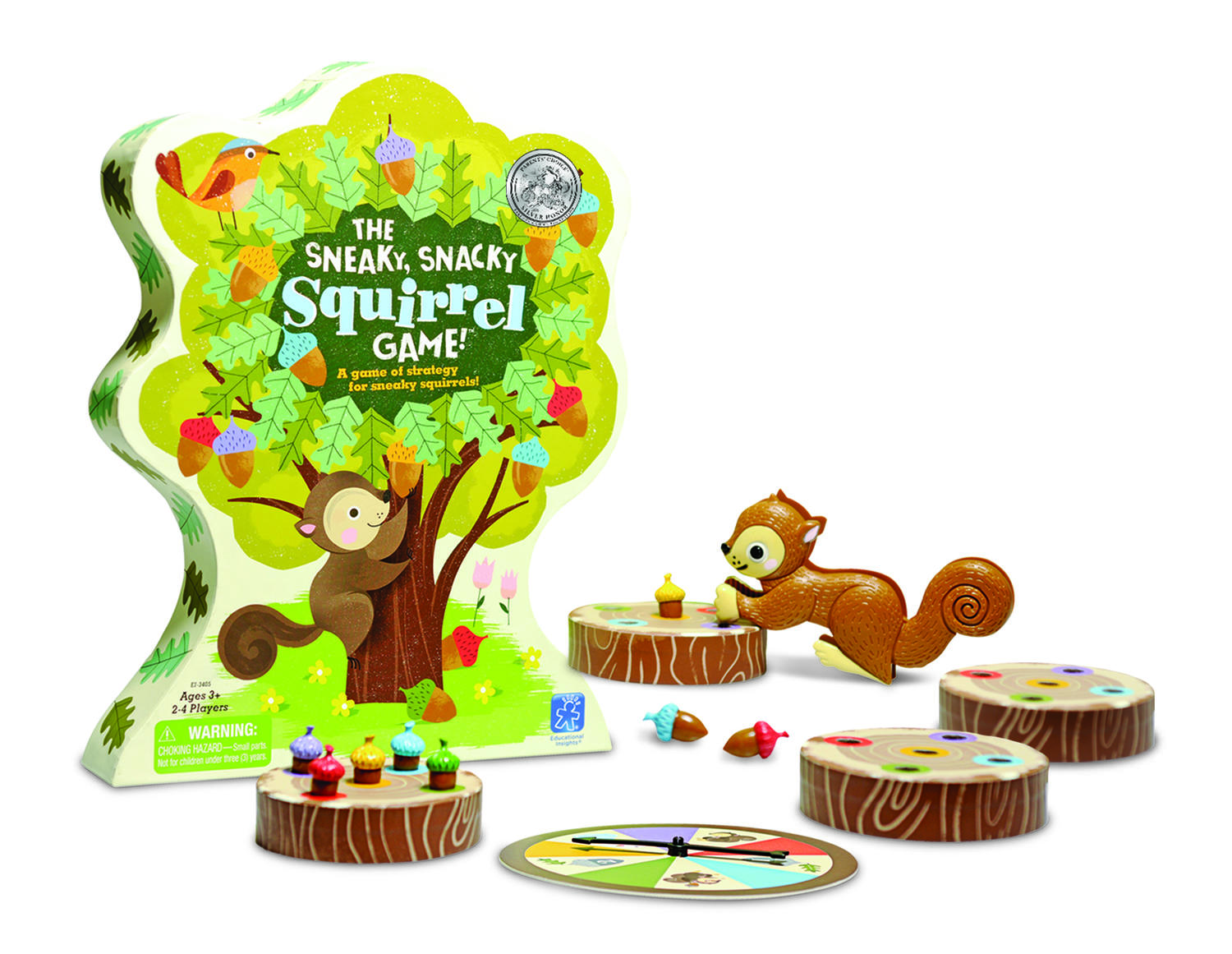 Mod de utilizare: copiii invart acul ruletei, apoi folosesc clipsul in forma de veverita pentru a culege ghindele in functie de culoarea si numarul indicate. Castiga jucatorul care reuseste sa potriveasca ghindele corect in trunchiurile de arbori.
