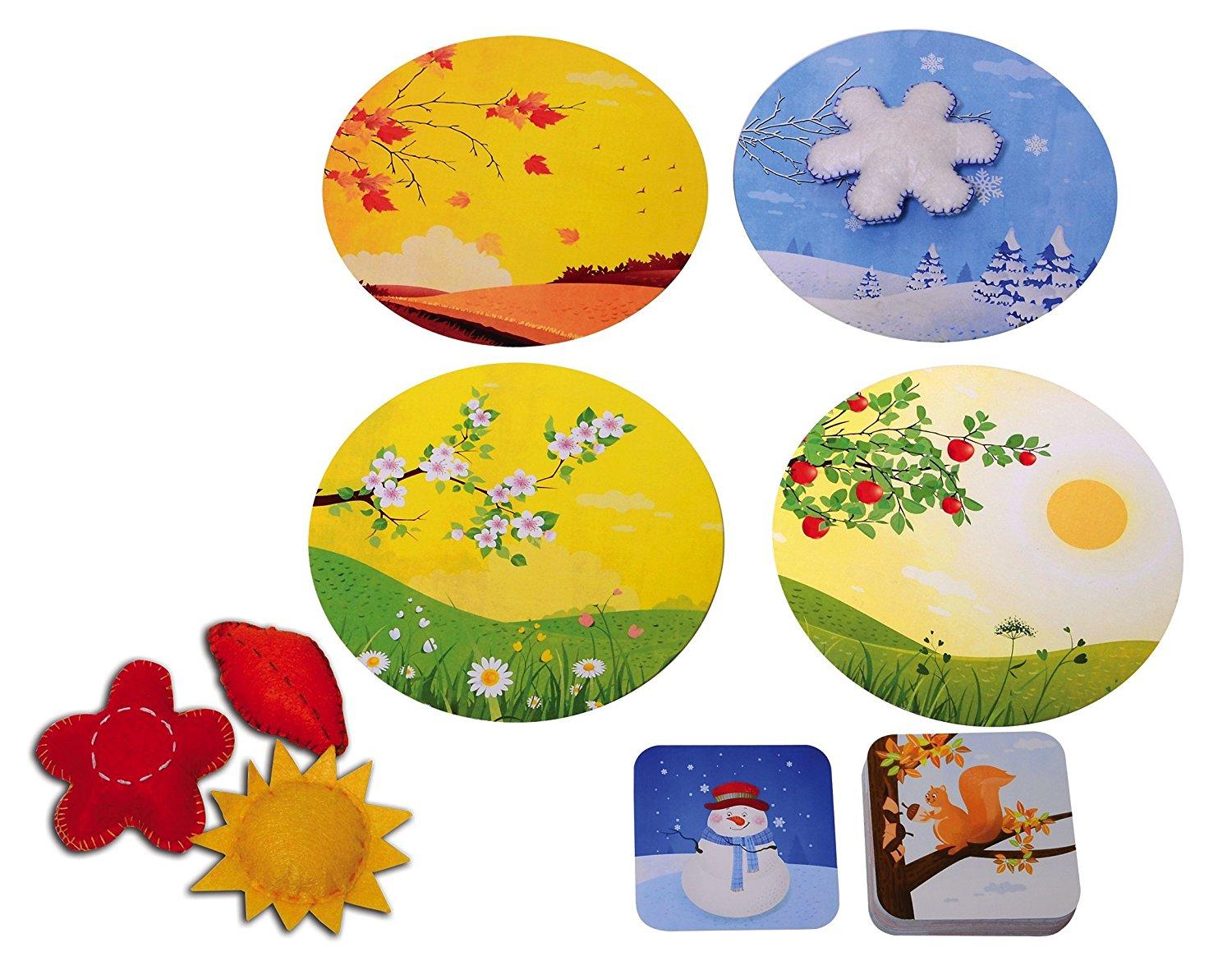 Regulament: Jucatorul care isi aminteste primul un cantecel cu anotimpuri incepe jocul. El/ea trage un card din teancul din centru. Toti copiii se uita la cardul respectiv si se gandesc la ce anotimp il pot incadra. Dupa ce ai stabilit anotimpul, alege una dintre cele 4 piese din fetru (floricica, soare, frunza sau fulg de nea) si asaz-o pe cardul cu anotimpul corespunzator. Primul jucator care pune piesa de fetru corecta peste anotimpul potrivit castiga cardul tras din teanc. Spre exemplu, cardul tras din teanc este un “Ventilator”. “Ventilatorul” apartine anotimpului “vara”. Primul jucator care asaza “Soarele” din fetru peste cardul cu anotimpul “Vara” castiga cardul cu “Ventilator”. Daca un jucator nu alege piesa din fetru corecta sau o asaza peste un alt anotimp, trebuie sa puna la loc in teanc un card castigat in rundele anterioare. Daca nu a castigat inca nici un card, atunci nu face nimic. Jocul se termina cand cardurile din teanc s-au terminat. Jucatorul care la sfarsitul jocului are cele mai multe carduri castiga jocul.