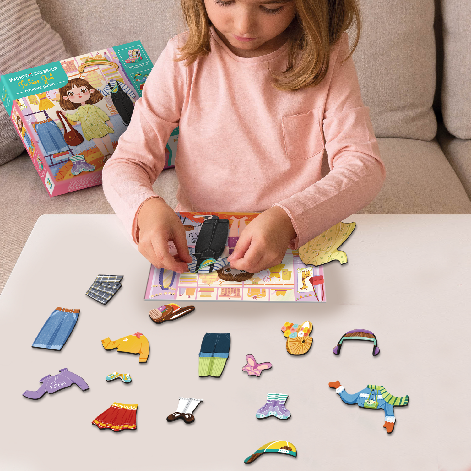 Utilizare: copilul alege magnetii preferati, ii combina si ii asaza pe plansa pentru a crea tinute noi si amuzante. Jocul este simplu, intuitiv si potrivit pentru micile pasionate de moda.