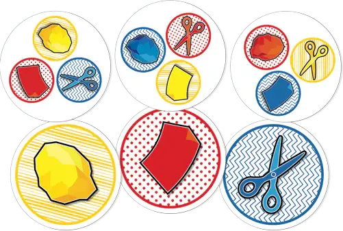Carduri cu model fata verso ilustrate cu simboluri colorate (piatra, foarfeca, hartie)