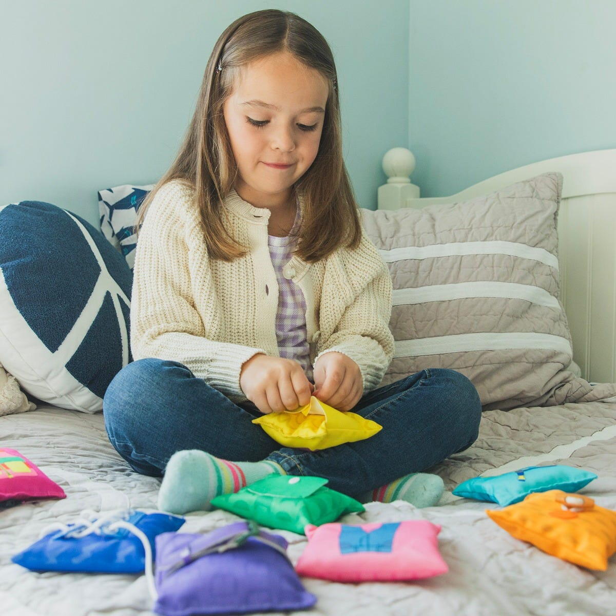 Fiecare dintre cei 8 saculeti colorati are pe o parte o ilustratie cu un articol de imbracaminte sau incaltaminte, iar pe cealalta parte un sistem real de prindere, precum fermoar, nasturi, capse, catarama sau sireturi. Astfel, copilul invata prin joaca abilitati esentiale pentru imbracatul independent, utile atat acasa, cat si la gradinita sau in activitati educationale.