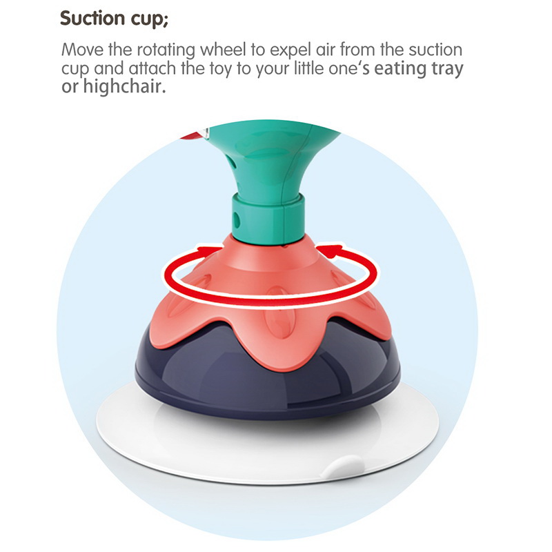 Datorita bazei cu ventuza puternica, jucaria se fixeaza usor pe masa copilului, pe scaunul de masa, pe parchet sau pe alte suprafete plane. Bebelusul poate roti, trage si apasa diferite componente, transformand fiecare moment de joaca intr-o experienta distractiva si educativa.