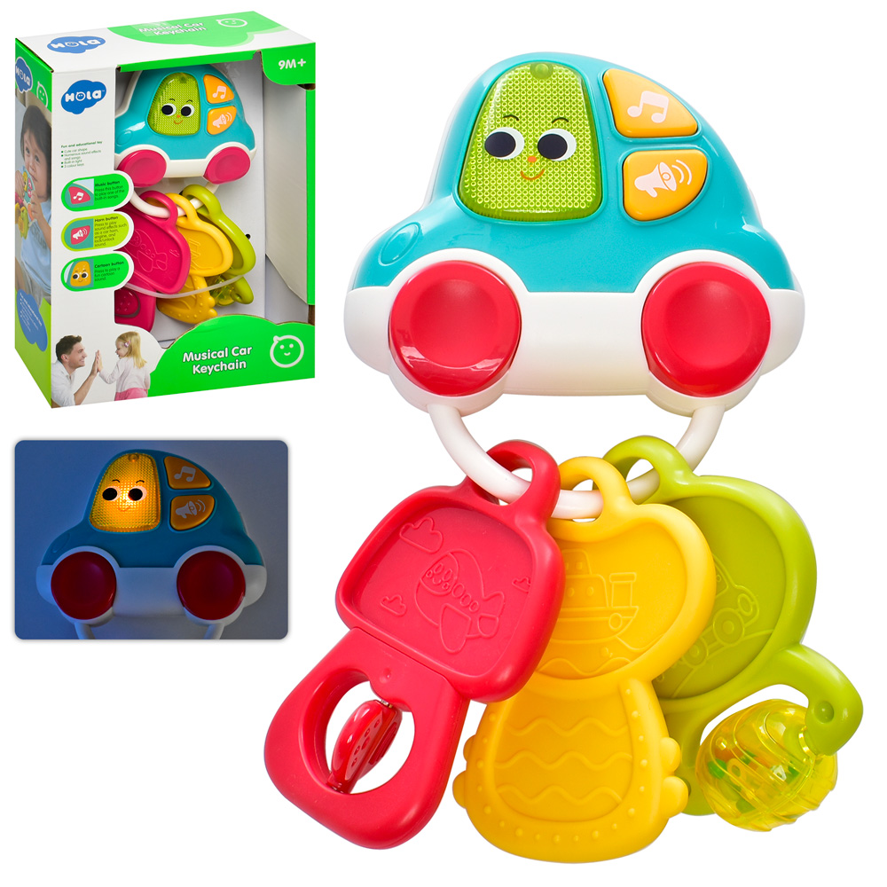Masinuta include trei chei mari, usor de prins de manutele mici. Cheia rosie are o inimioara rotativa, cheia galbena functioneaza ca jucarie de dentitie din cauciuc texturat, iar cheia verde este prevazuta cu o bila rotativa cu margele colorate. Butoanele de pe bord activeaza lumini, sunete si melodii, oferind o experienta distractiva si educativa.