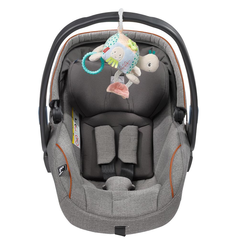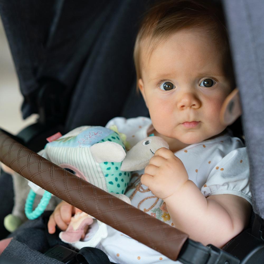 Datorita sistemului de prindere, poate fi atasata usor la carucior, patut sau scoica, fiind potrivita atat acasa, cat si in plimbari. Materialele moi si placute la atingere ofera confort, iar dimensiunea este adaptata manutelor mici.