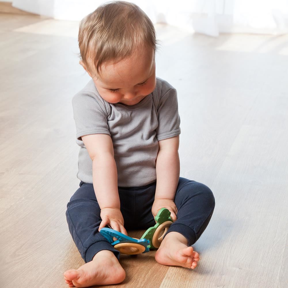 Oferă jucăria bebelușului pentru a o apuca, explora și roade sub supravegherea unui adult. Este potrivită pentru momentele în care gingiile sunt sensibile, dar și ca jucărie senzorială de zi cu zi.