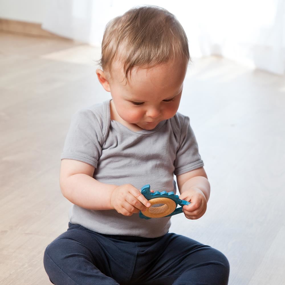 Transformă perioada dentiției într-o experiență mai plăcută cu această jucărie pentru dentiție bebe în formă de dinozaur, realizată din cauciuc natural și lemn. Designul ergonomic și textura reliefată sunt gândite pentru a fi ușor de prins de mâinile mici, iar suprafața moale ajută la masarea delicată a gingiilor sensibile.