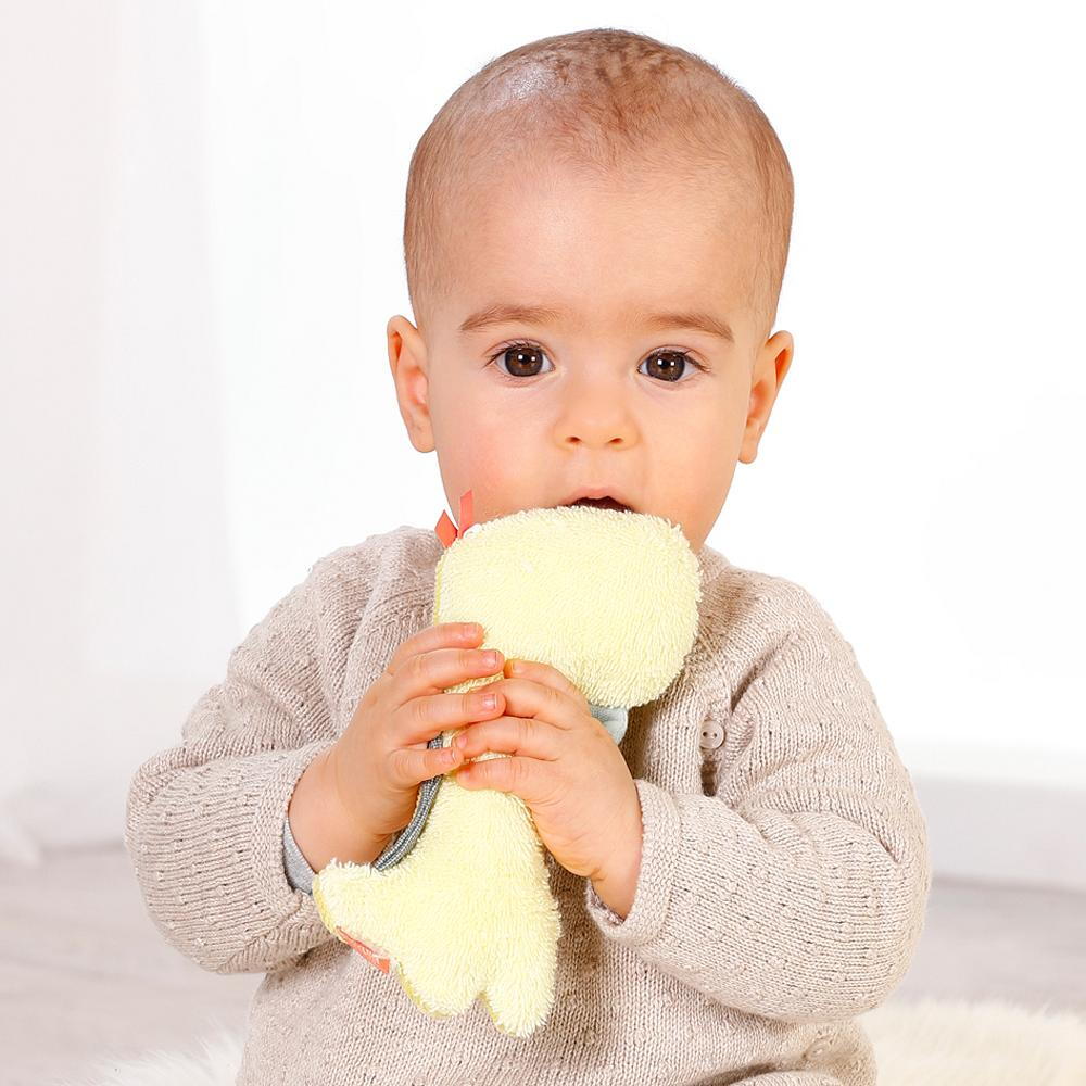 Utilizare: jucăria poate fi oferită bebelușului pentru joacă supravegheată, acasă sau în deplasare. Este excelentă pentru activități de explorare tactilă și auditivă, ajutând copilul să descopere texturi și reacții simple prin apăsare.