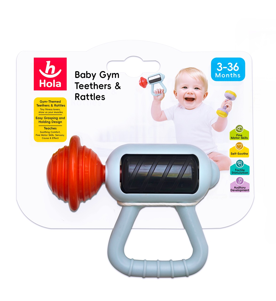 Alege o jucărie zornăitoare de dentiție practică și distractivă pentru cei mici. Modelul Hola, în formă de pistol de masaj, este special conceput pentru mâinile bebelușilor, fiind ușor de apucat, manevrat și explorat. Texturile și sunetele produse contribuie la stimularea senzorială, iar forma ergonomică susține dezvoltarea coordonării și a motricității fine.