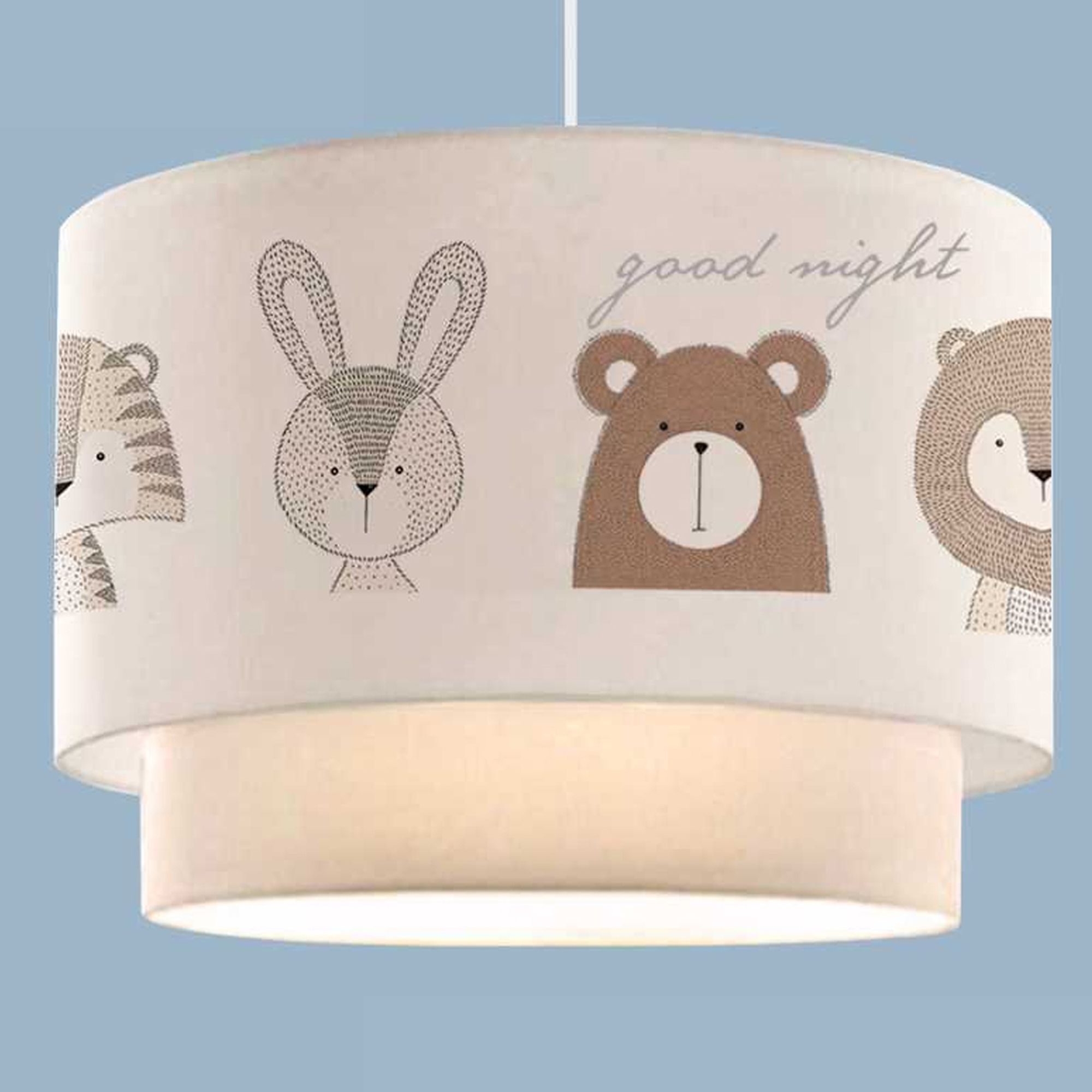 Die Pendelleuchte verfügt über einen schlichten Lampenschirm sowie einen dekorativen Außenschirm, der mit einem verspielten und kindgerechten Motiv bedruckt ist. Die Lampenfassung hält das Leuchtmittel sicher an seinem Platz und sorgt für eine zuverlässige, alltagstaugliche Beleuchtung.