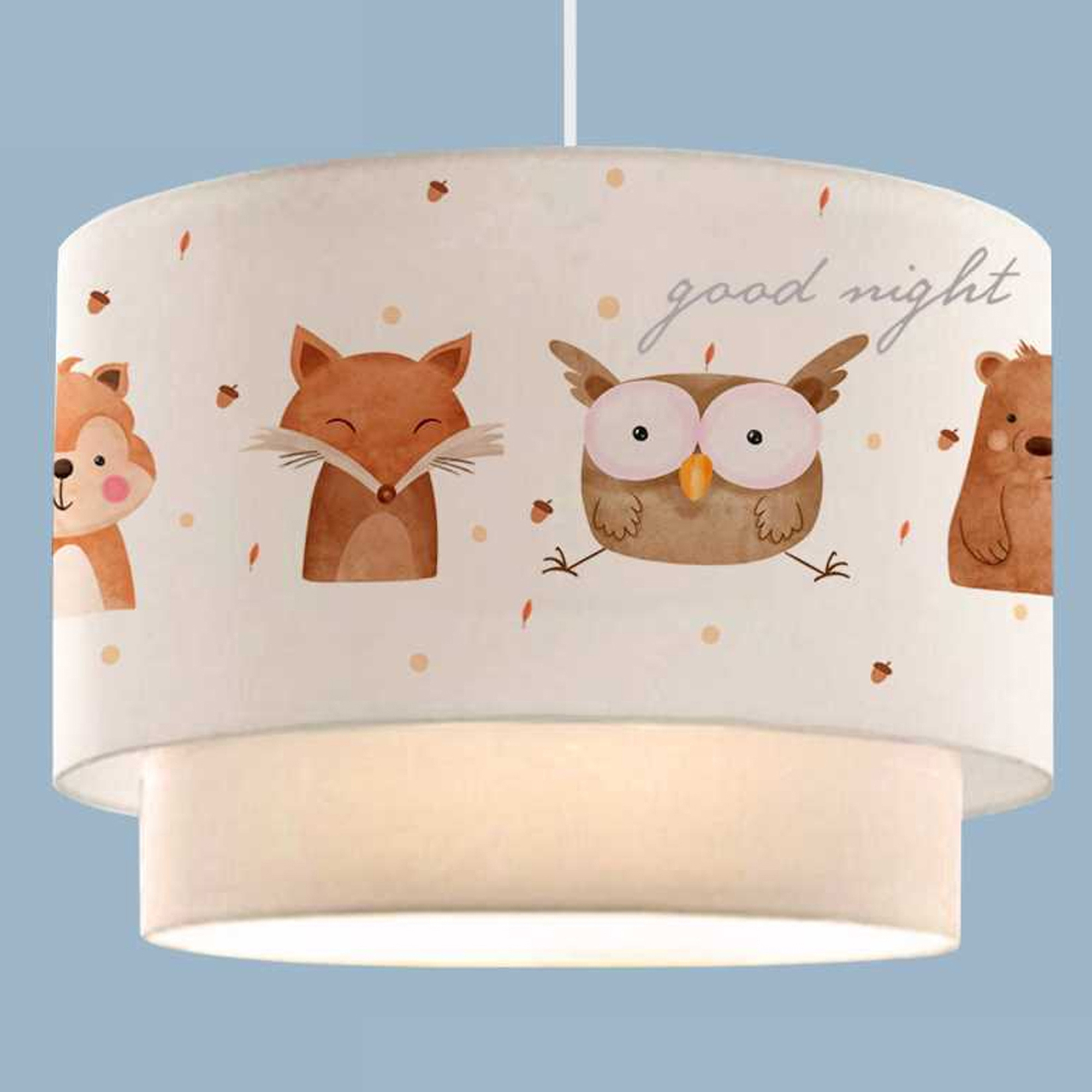 Die Pendelleuchte verfügt über einen schlichten Lampenschirm sowie einen dekorativen Außenschirm, der mit einem verspielten und kindgerechten Motiv bedruckt ist. Die Lampenfassung hält das Leuchtmittel sicher an seinem Platz und sorgt für eine zuverlässige, alltagstaugliche Beleuchtung.