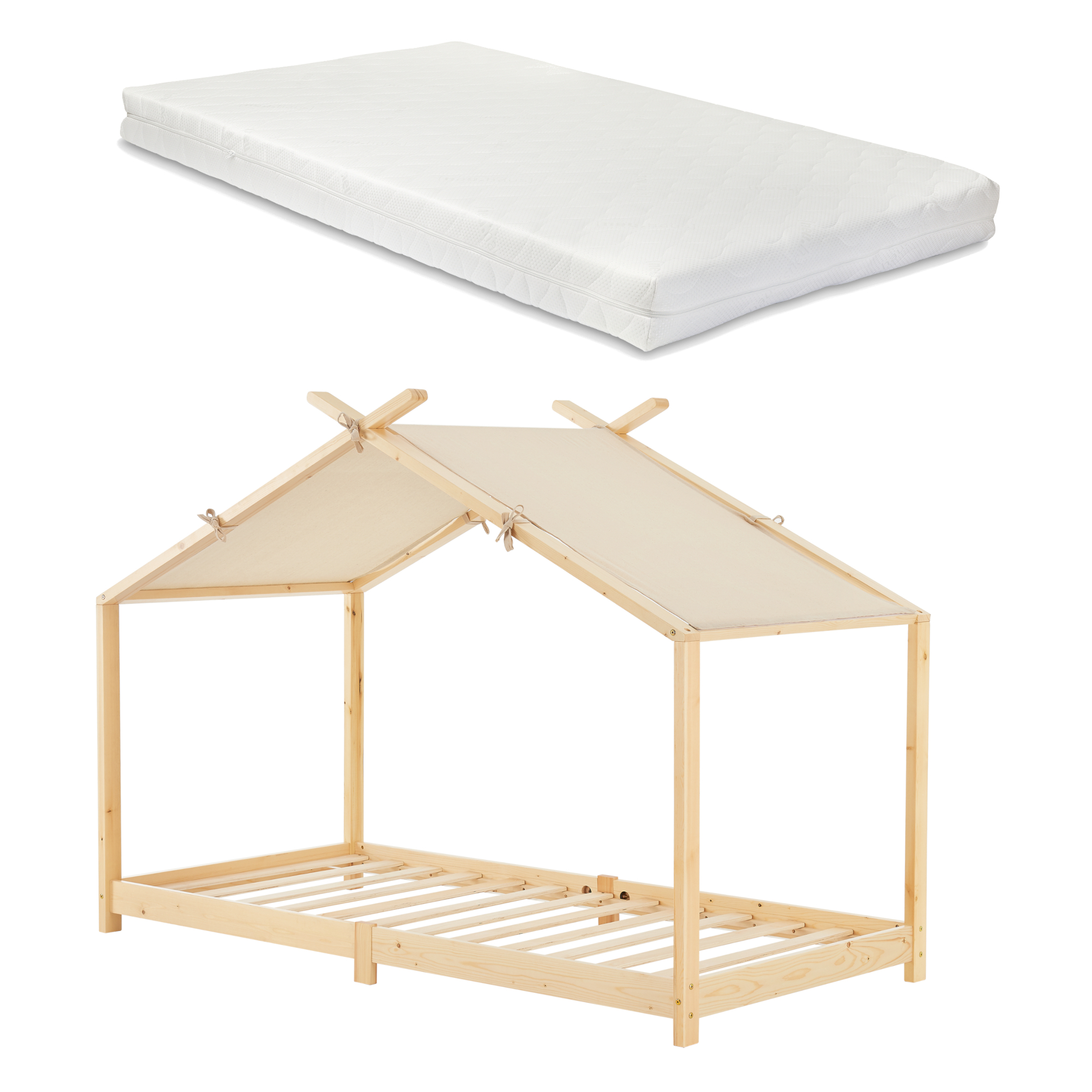 Das Hausbett verfügt über ein abnehmbares Dach, das mit einem praktischen Klettverschluss leicht befestigt und entfernt werden kann, um eine heimelige Umgebung zu schaffen, in der sich Ihr Kind sicher und geborgen fühlt.